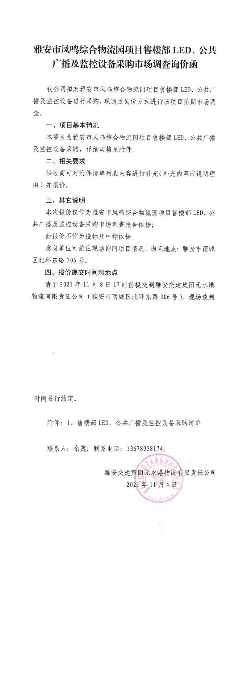 雅安交建集團(tuán)無(wú)水港物流有限責(zé)任公司雅安市鳳鳴綜合物流園項(xiàng)目售樓部LED、公共廣播及監(jiān)控設(shè)備采購(gòu)市場(chǎng)調(diào)查詢(xún)價(jià)函