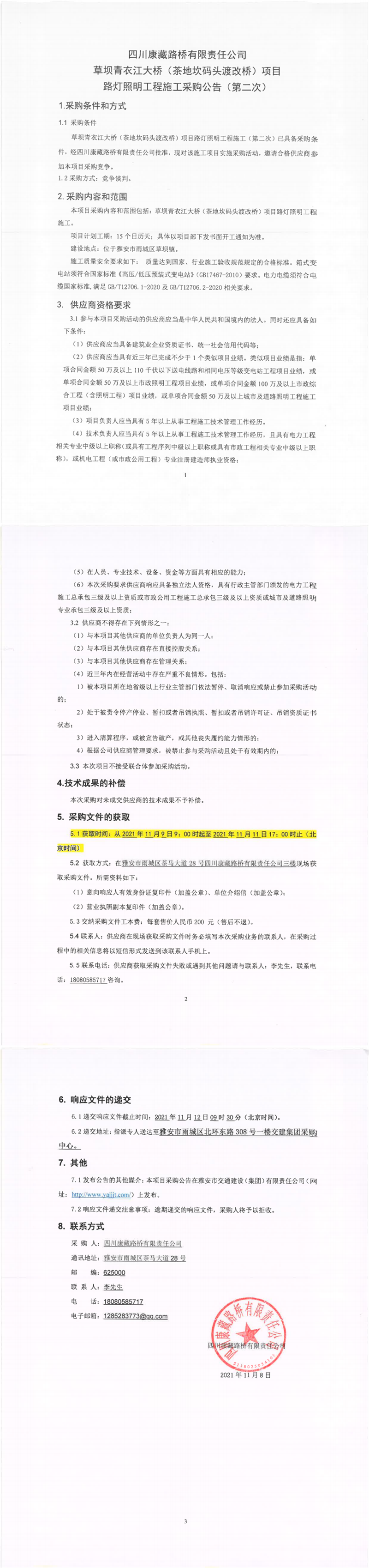 四川康藏路橋有限責任公司草壩青衣江大橋(茶地坎碼頭渡改橋)項目路燈照明工程施工采購公告(第二次)