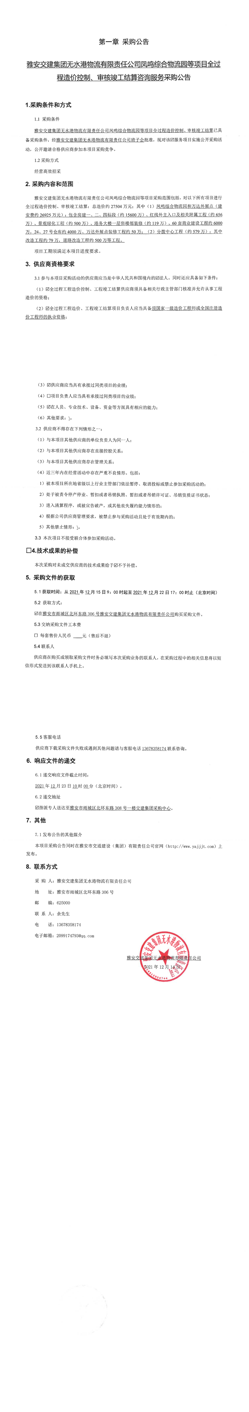 雅安交建集團(tuán)無(wú)水港物流有限責(zé)任公司鳳鳴綜合物流等項(xiàng)目全過(guò)程造價(jià)控制、審核竣工結(jié)算咨詢服務(wù)采購(gòu)公告