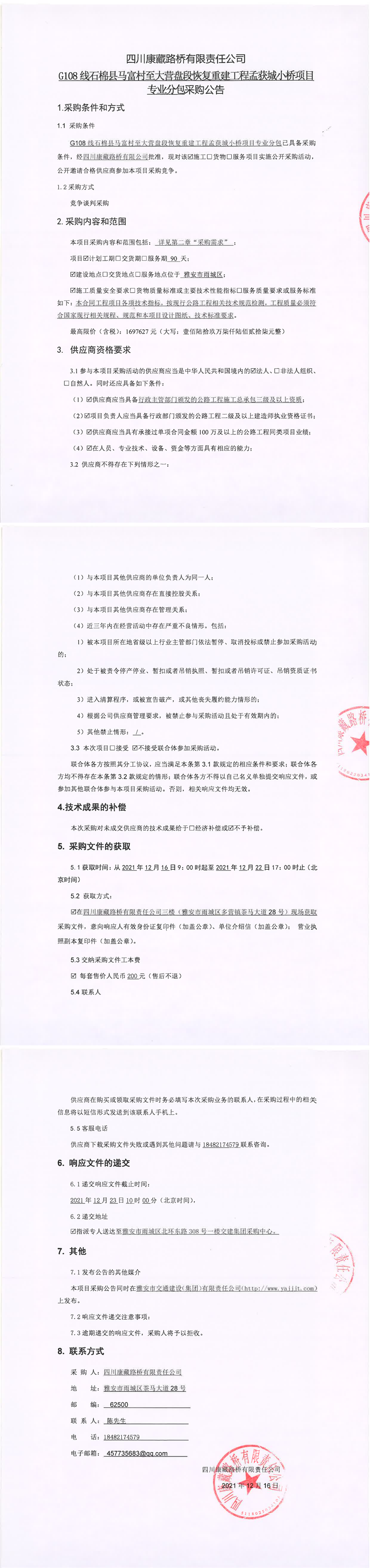 四川康藏路橋有限責(zé)任公司G108線石棉縣馬富村至大營盤段恢復(fù)重建工程孟獲城小橋項(xiàng)目專業(yè)分包采購公告