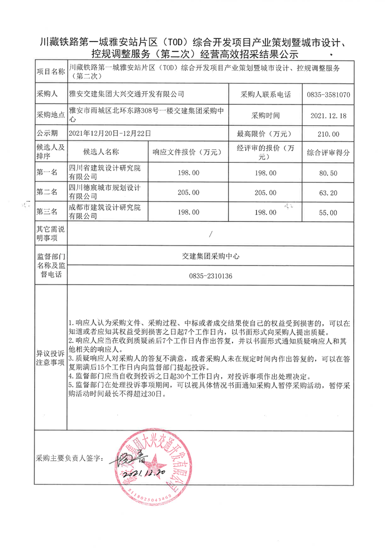 雅安交建集團(tuán)大興交通開發(fā)有限公司川藏鐵路第一城雅安站片區(qū)(TOD)綜合開發(fā)項目產(chǎn)業(yè)策劃暨城市設(shè)計、控規(guī)調(diào)整服務(wù)(第二次)經(jīng)營高效招采結(jié)果公示