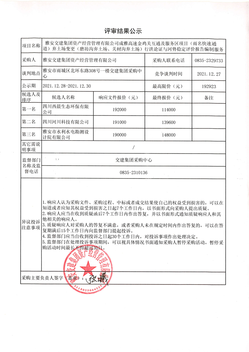 雅安交建集團資產(chǎn)經(jīng)營管理有限公司成雅高速金雞關(guān)互通及服務區(qū)項目(雨名快速通道)棄土場變更(磨坊溝棄土場、關(guān)材溝棄土場)行洪論證與河勢穩(wěn)定評價報告編制服務評審結(jié)果公示