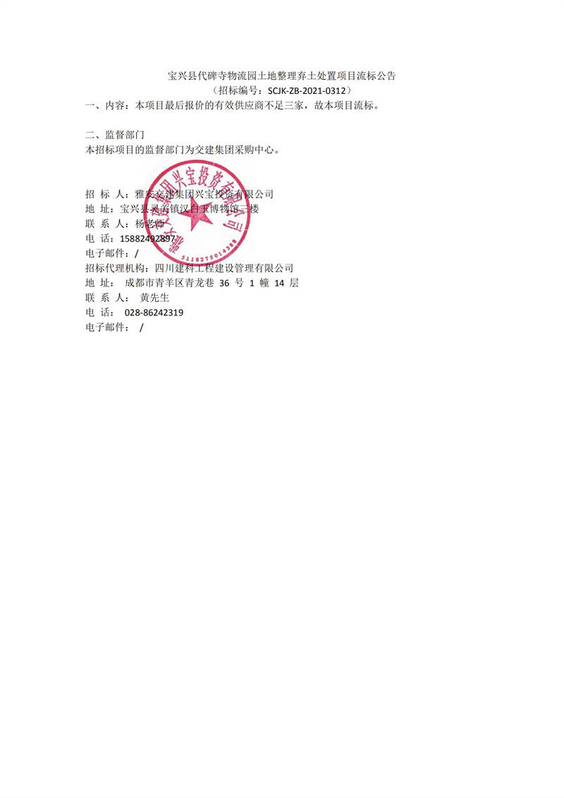 雅安交建集團(tuán)興寶投資有限公司寶興縣代碑寺物流園土地整理?xiàng)壨撂幹庙?xiàng)目流標(biāo)公告