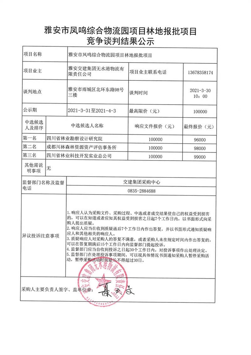 雅安交建集團無水港物流有限責任公司雅安市鳳鳴綜合物流園項目林地報批項目競爭談判結果公示