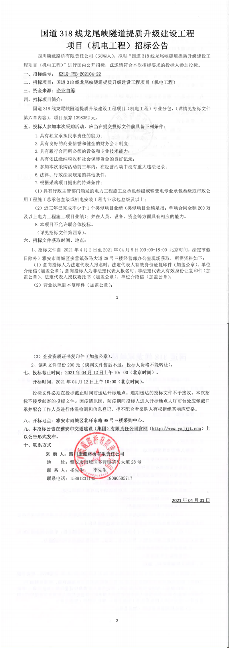 四川康藏路橋有限責(zé)任公司國(guó)道318線龍尾峽隧道提質(zhì)升級(jí)建設(shè)工程項(xiàng)目(機(jī)電工程)招標(biāo)公告