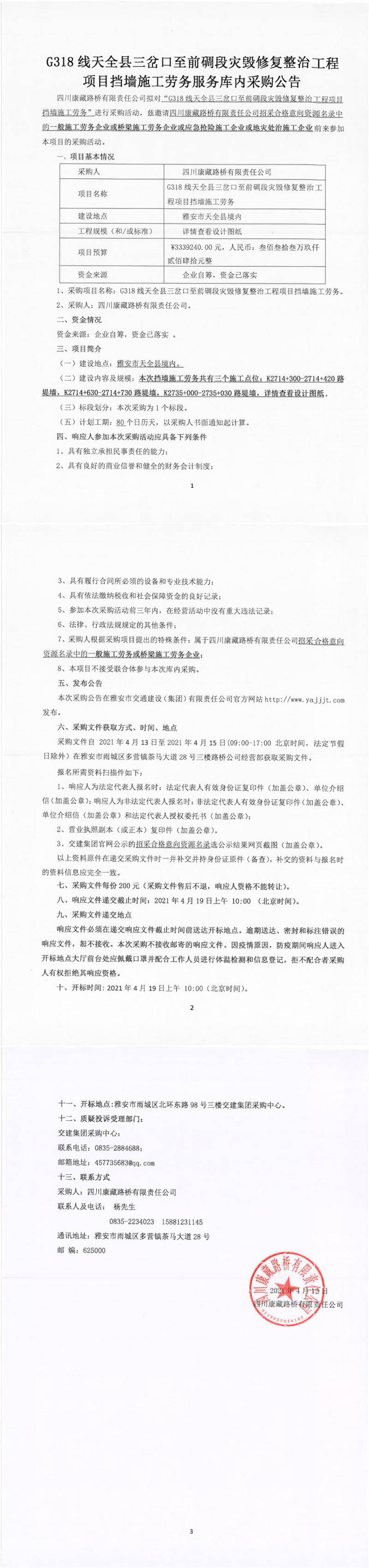 四川康藏路橋有限責任公司G318線天全縣三岔口至前碉段災毀修復整治工程項目擋墻施工勞務服務庫內采購公告