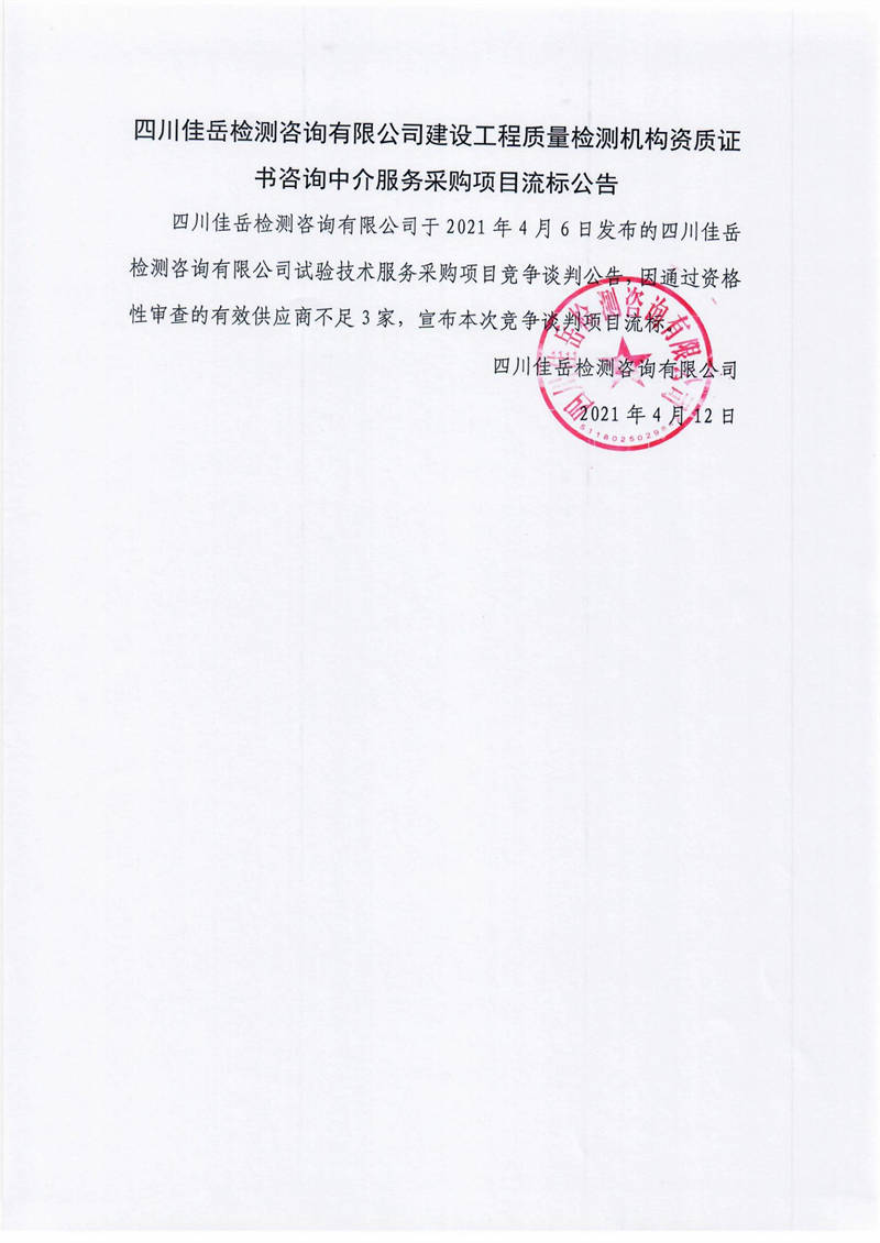 四川佳岳檢測咨詢有限公司建設工程質(zhì)量檢測機構資質(zhì)證書咨詢中介服務采購項目流標公告