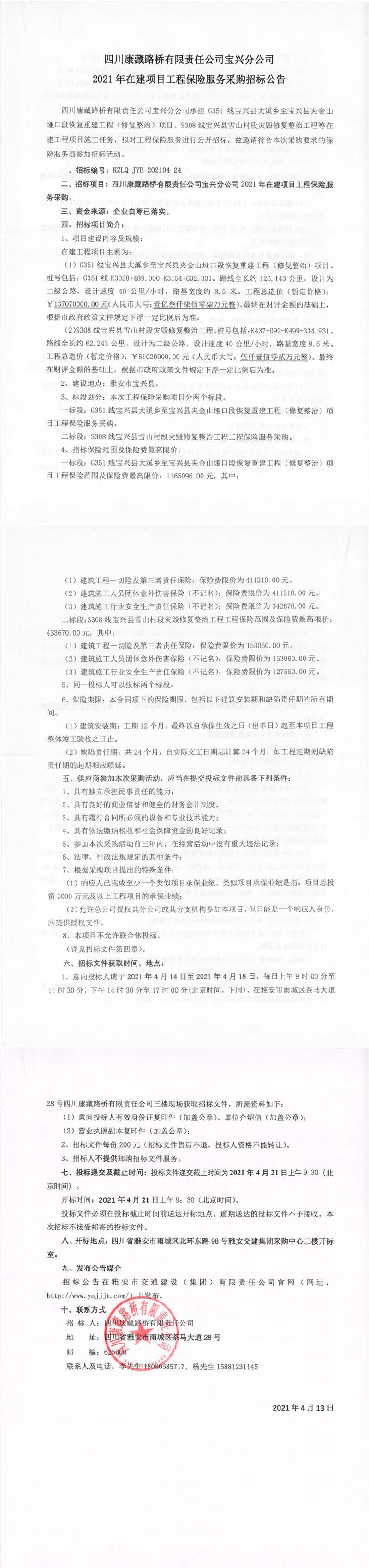 四川康藏路橋有限責(zé)任公司寶興分公司2021年在建項(xiàng)目工程保險(xiǎn)服務(wù)采購(gòu)招標(biāo)公告