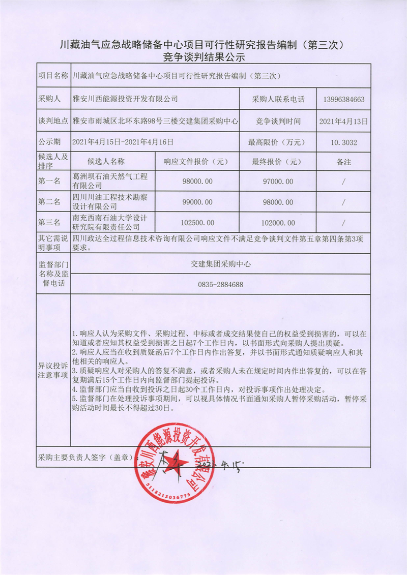 雅安川西能源投資開發(fā)有限公司川藏油氣應(yīng)急戰(zhàn)略儲(chǔ)備中心項(xiàng)目可行性研究報(bào)告編制 (第三次)競爭談判結(jié)果公示