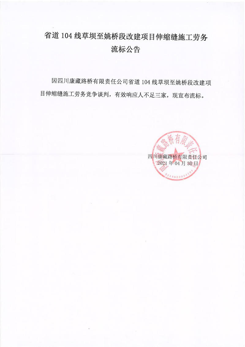 四川康藏路橋有限責任公司省道104線草壩至姚橋段改建項目伸縮縫施工勞務流標公告