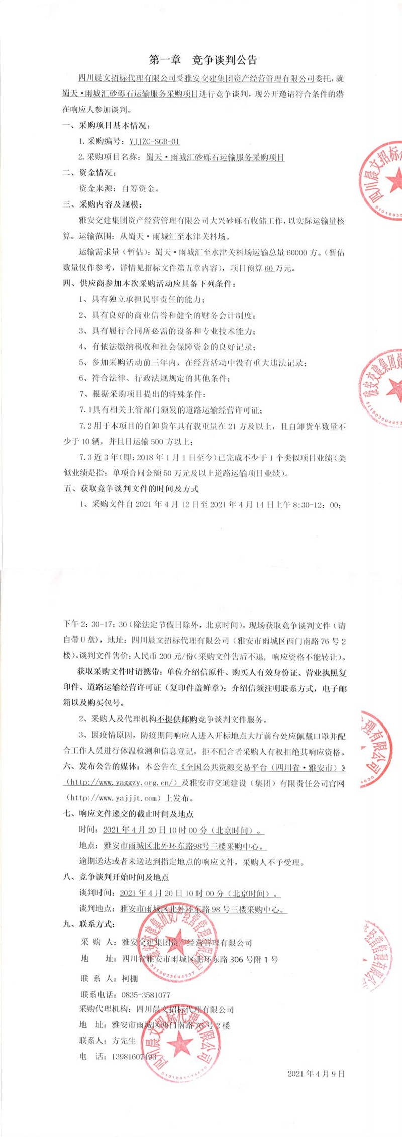 雅安交建集團資產(chǎn)經(jīng)營管理有限公司蜀天.雨城匯砂礫石運輸服務采購項目競爭談判公告
