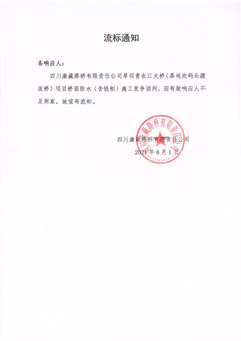 四川康藏路橋有限責(zé)任公司草壩青衣江大橋(茶地坎碼頭渡改橋)項目橋面防水(含銑刨)施工競爭談判流標(biāo)通知