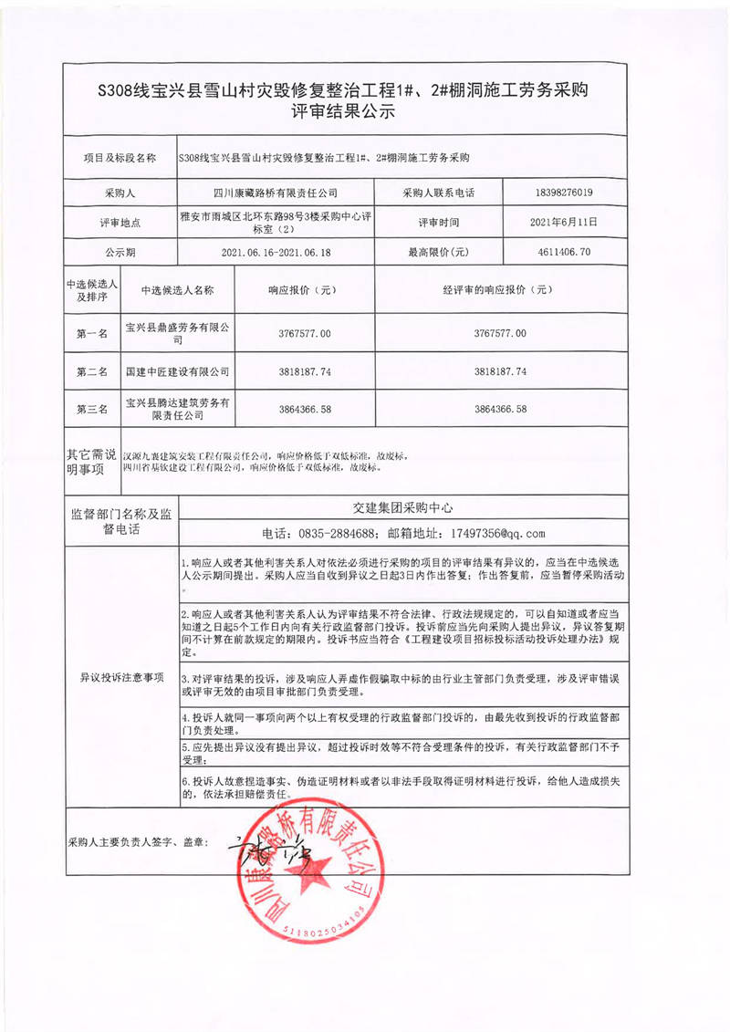 四川康藏路橋有限責任公司S308線寶興縣雪山村災毀修復整治工程1#、2#棚洞施工勞務采購評審結(jié)果公示