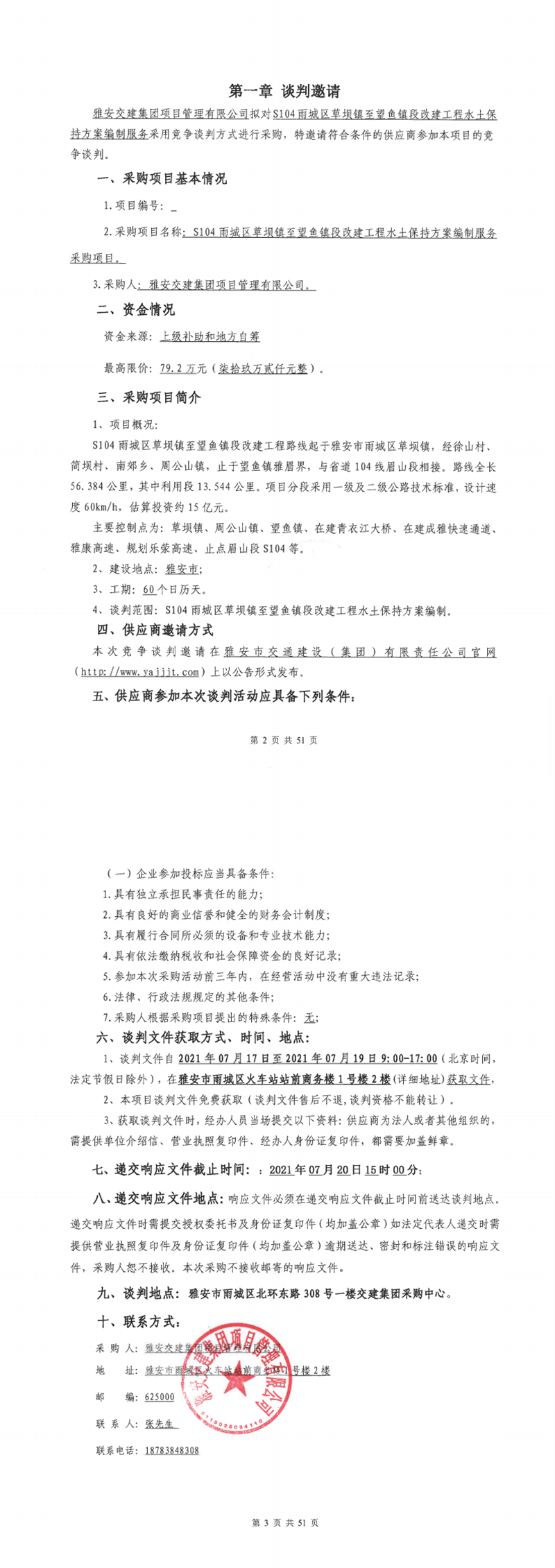 雅安交建集團(tuán)項(xiàng)目管理有限公司S104雨城區(qū)草壩鎮(zhèn)至望魚(yú)段改建工程水土保持方案編制服務(wù)采購(gòu)項(xiàng)目競(jìng)爭(zhēng)談判公告