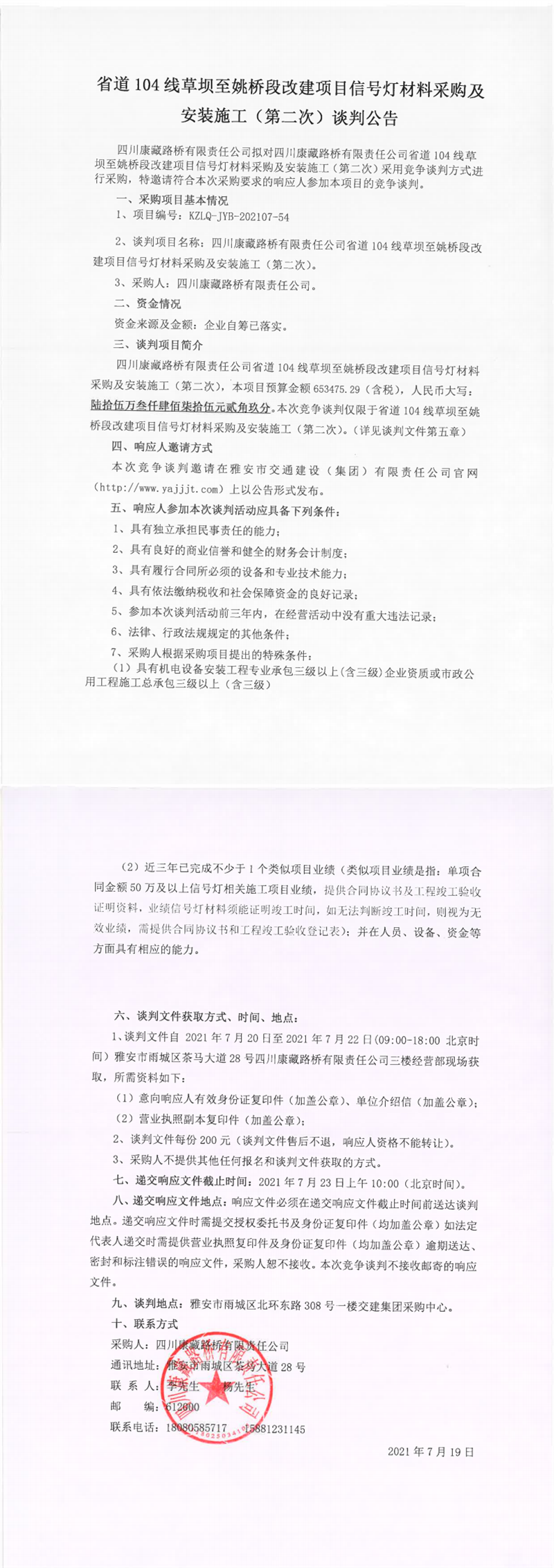 四川康藏路橋有限責(zé)任公司省道104線草壩至姚橋段改建項目信號燈材料采購及安裝施工(第二次)談判公告