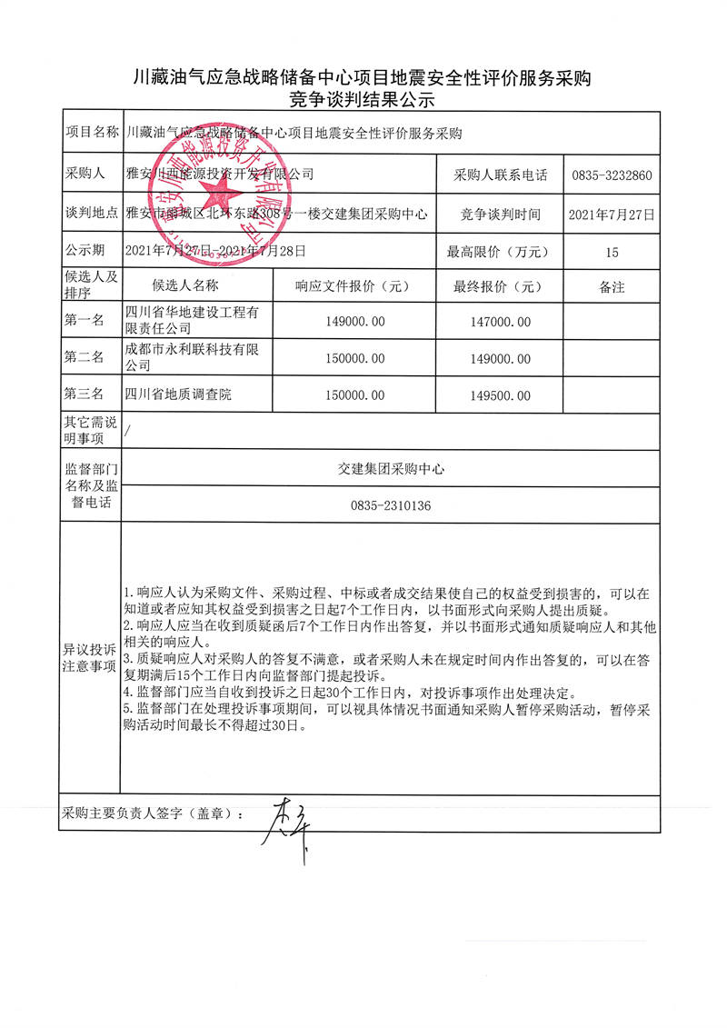 雅安川西能源投資開發(fā)有限公司川藏油氣應(yīng)急戰(zhàn)略儲(chǔ)備中心項(xiàng)目地震安全性評價(jià)服務(wù)采購競爭談判結(jié)果公示