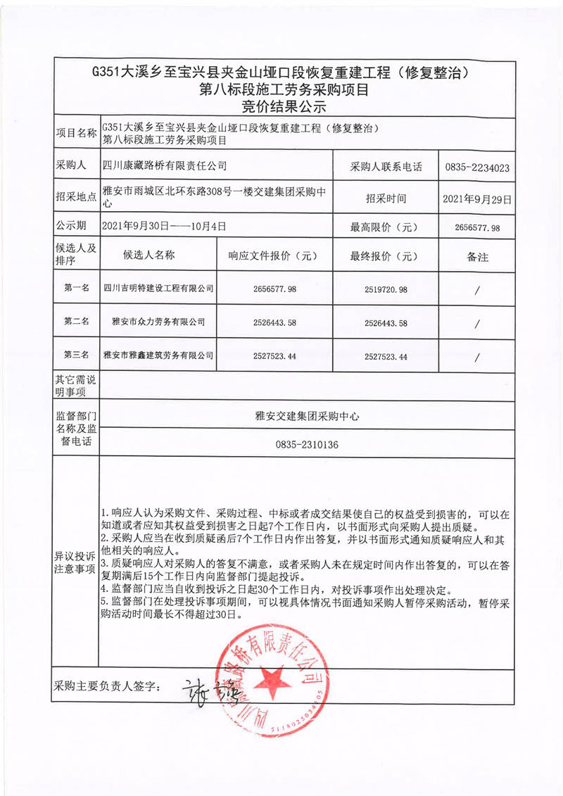 四川康藏路橋有限責(zé)任公司G351大溪鄉(xiāng)至寶興縣夾金山埡口段恢復(fù)重建工程(修復(fù)整治)第八標(biāo)段施工勞務(wù)采購項目競價結(jié)果公示