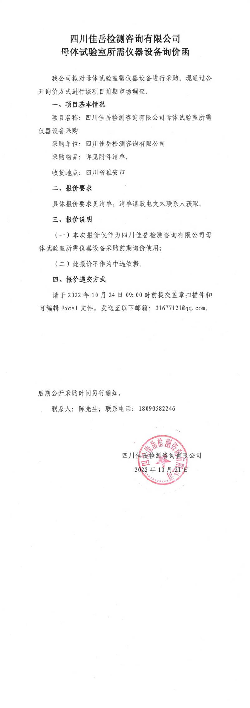 四川佳岳檢測咨詢有限公司母體試驗(yàn)室所需儀器設(shè)備詢價(jià)函