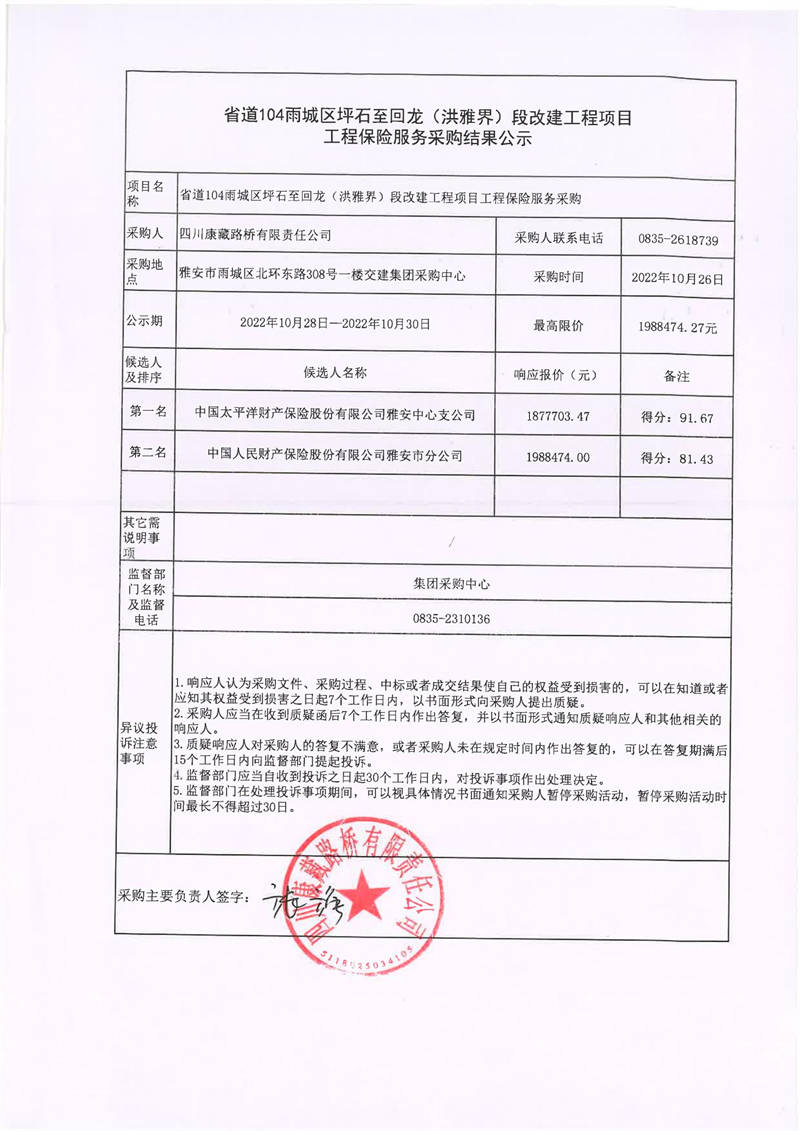 四川康藏路橋有限責(zé)任公司省道104雨城區(qū)坪石至回龍(洪雅界)段改建工程項(xiàng)目工程保險(xiǎn)服務(wù)采購結(jié)果公示