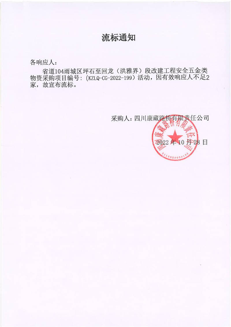 四川康藏路橋有限責(zé)任公司省道104雨城區(qū)坪石至回龍(洪雅界)段改建工程安全五金類物資采購(gòu)項(xiàng)目流標(biāo)通知