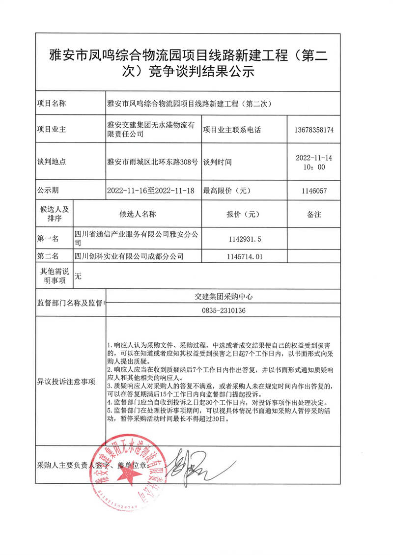 雅安交建集團無水港物流有限責任公司雅安市鳳鳴綜合物流園項目線路新建工程(第二次)競爭談判結果公示