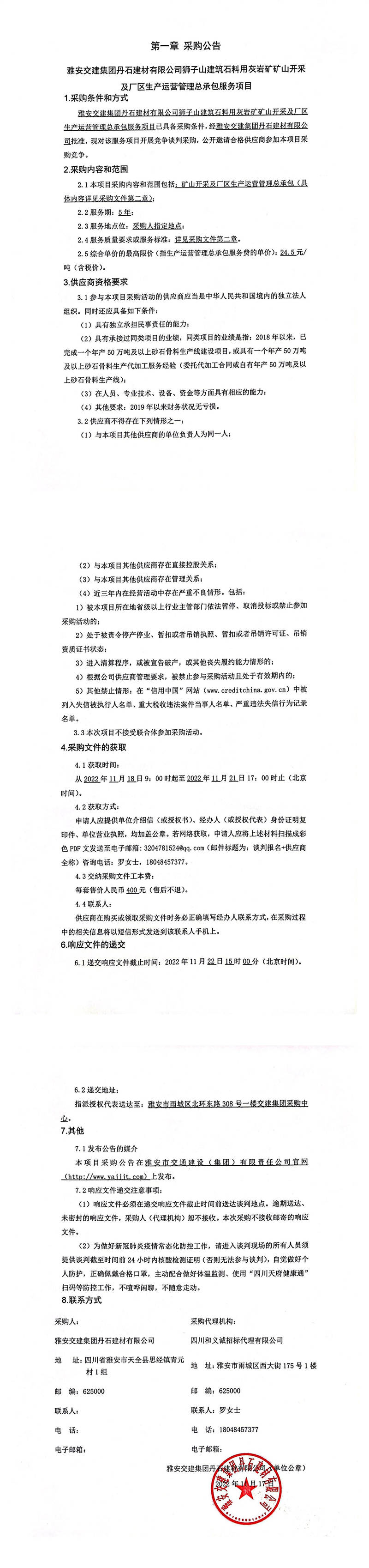 雅安交建集團丹石建材有限公司獅子山建筑石料用灰?guī)r礦礦山開采及廠區(qū)生產運營管理總承包服務項目采購公告