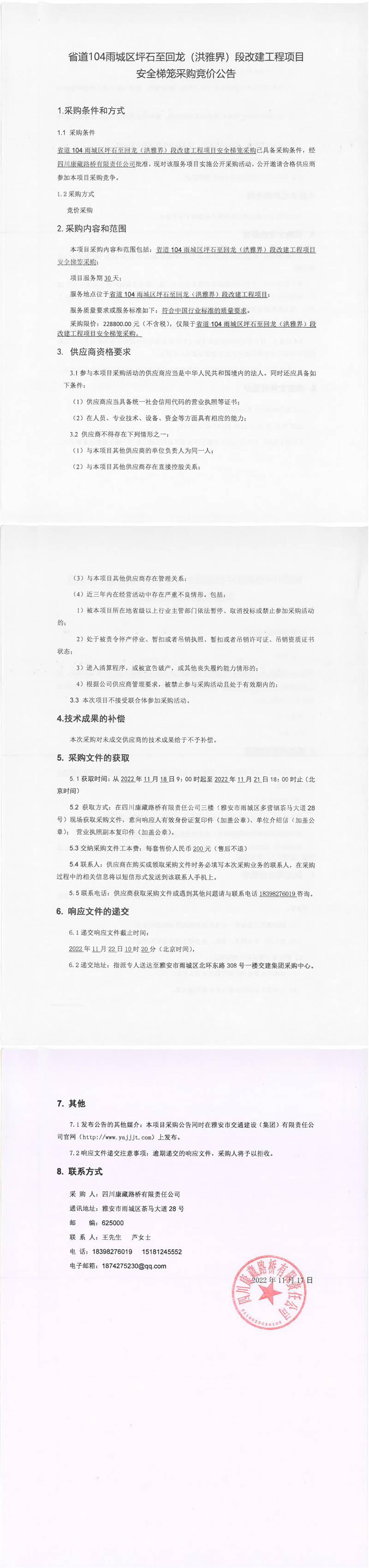 四川康藏路橋有限責(zé)任公司省道104雨城區(qū)坪石至回龍(洪雅界)段改建工程項(xiàng)目安全梯籠采購競價(jià)公告