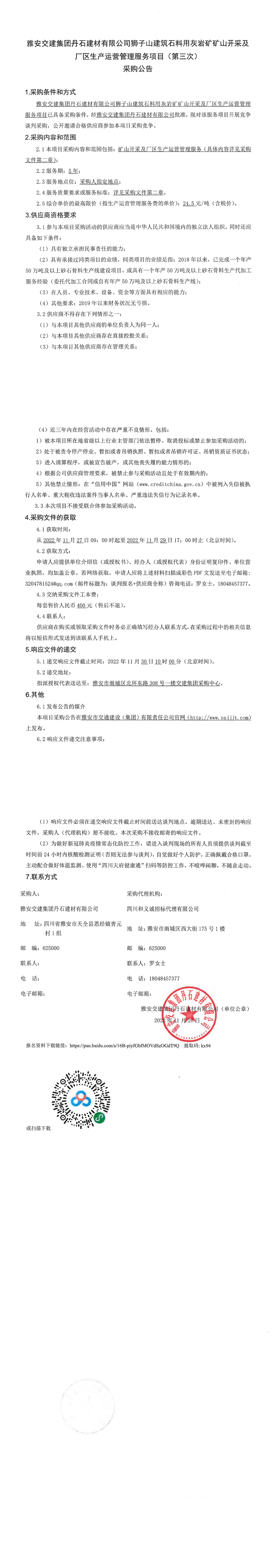 雅安交建集團(tuán)丹石建材有限公司獅子山建筑石料用灰?guī)r礦礦山開采及廠區(qū)生產(chǎn)運(yùn)營管理服務(wù)項目(第三次)采購公告