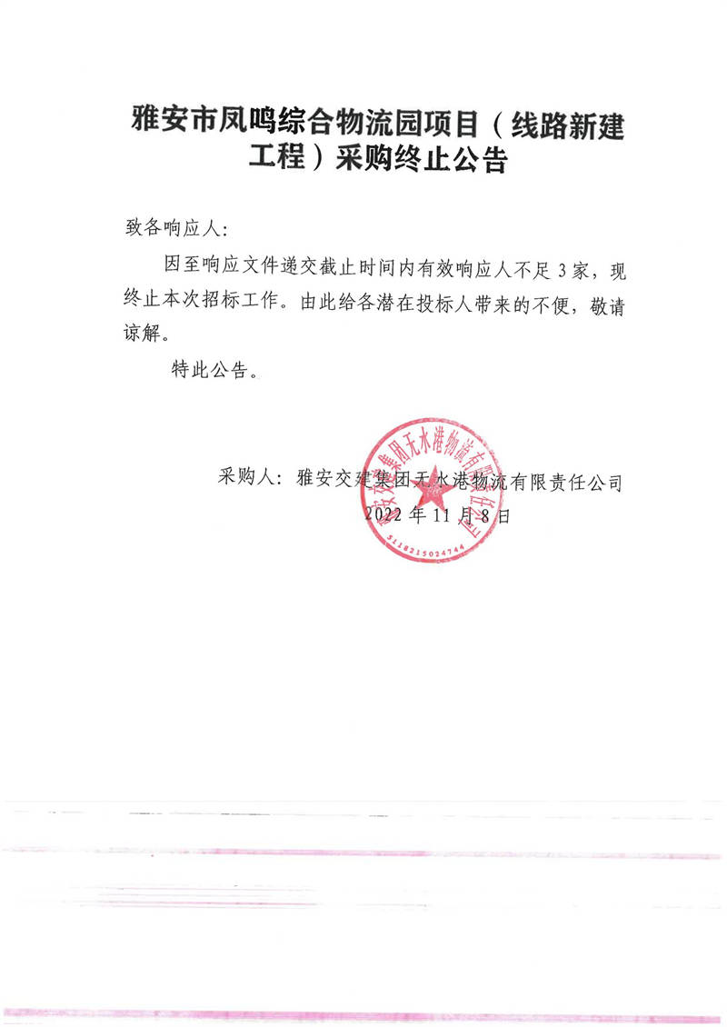 雅安交建集團無水港物流有限責(zé)任公司雅安市鳳鳴綜合物流園項目(線路新建工程)采購終止公告