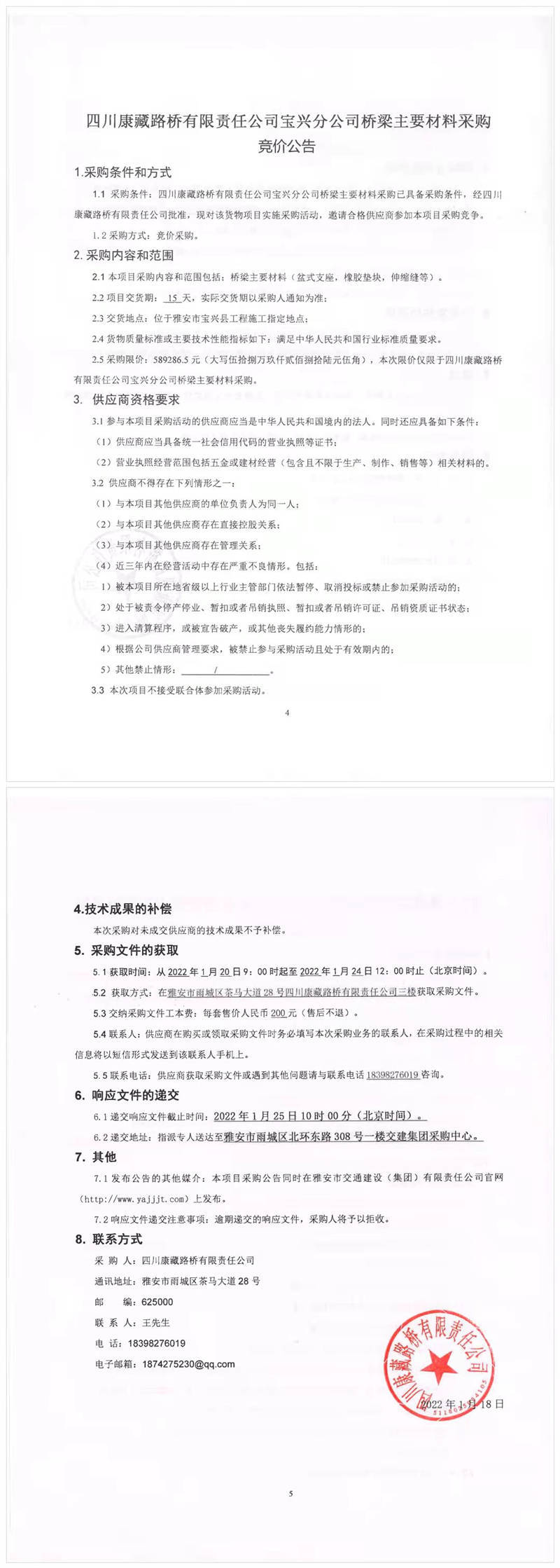 四川康藏路橋有限責(zé)任公司寶興分公司橋梁主要材料采購競價(jià)公告