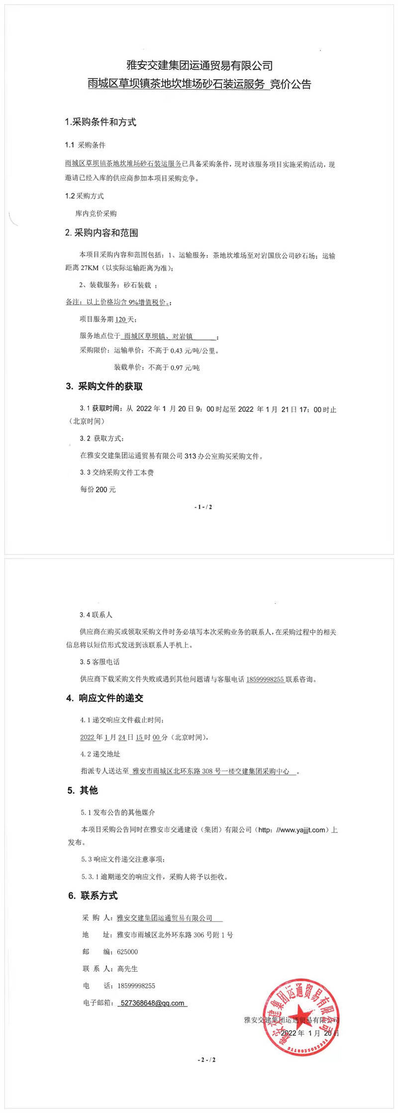 雅安交建集團(tuán)運(yùn)通貿(mào)易有限公司雨城區(qū)草壩鎮(zhèn)茶地坎堆場砂石裝運(yùn)服務(wù)競價(jià)公告