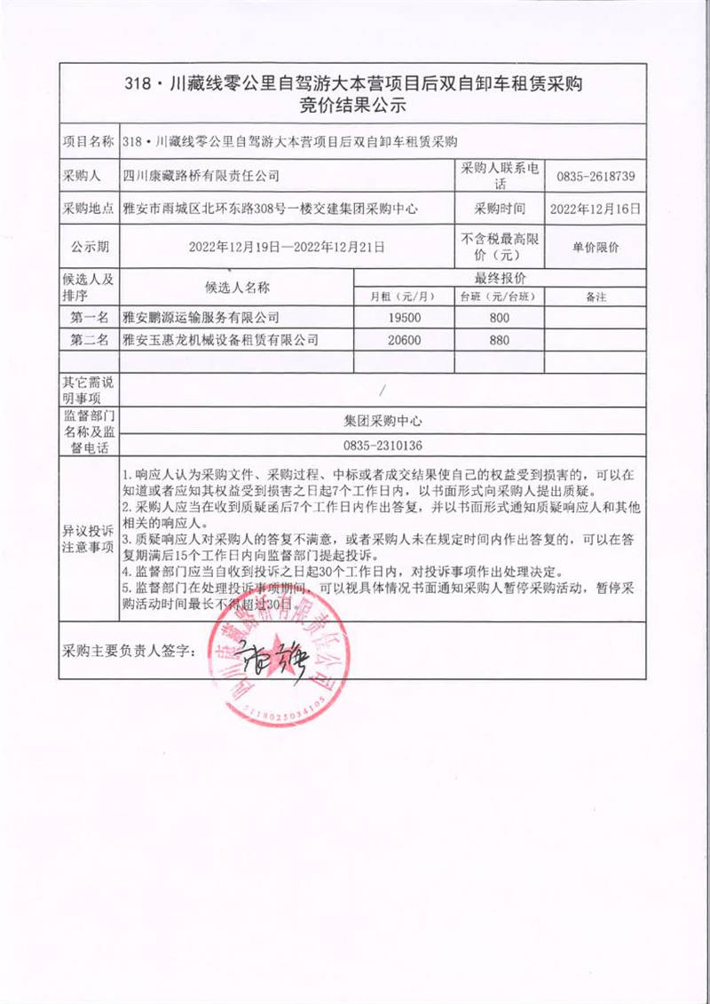 四川康藏路橋有限責任公司318·川藏線零公里自駕游大本營項目后雙自卸車租賃采購競價結果公示