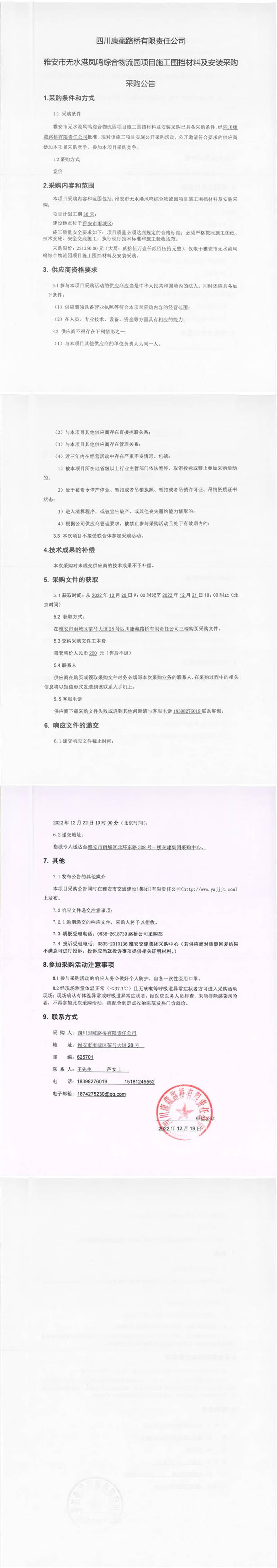 四川康藏路橋有限責(zé)任公司雅安市無水港鳳鳴綜合物流園項目施工圍擋材料及安裝采購采購公告