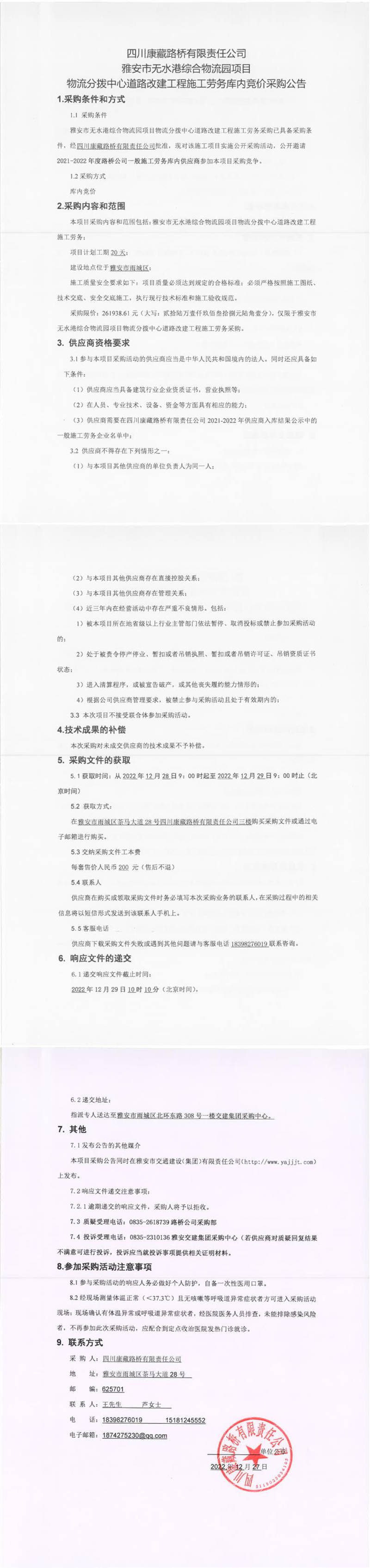 四川康藏路橋有限責任公司雅安市無水港綜合物流園項目物流分撥中心道路改建工程施工勞務庫內(nèi)競價采購公告