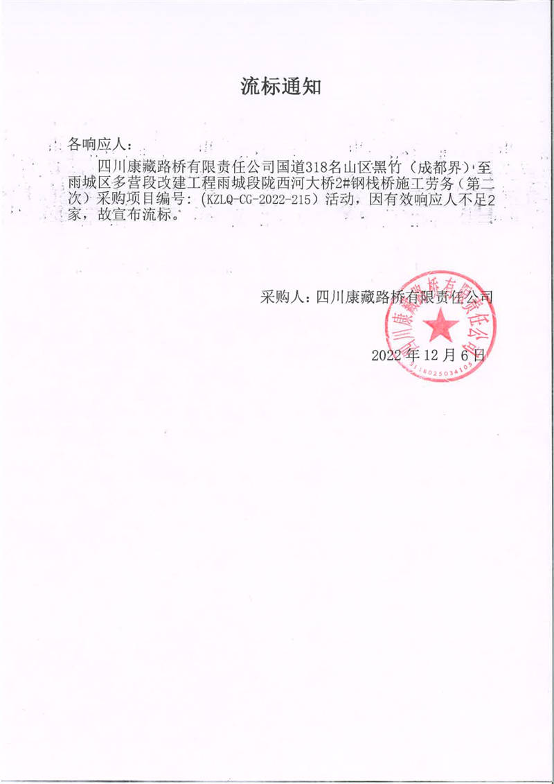 四川康藏路橋有限責(zé)任公司國道318名山區(qū)黑竹(成都界)至雨城區(qū)多營段改建工程雨城段隴西河大橋2#鋼棧橋施工勞務(wù)(第二次)采購項目流標通知
