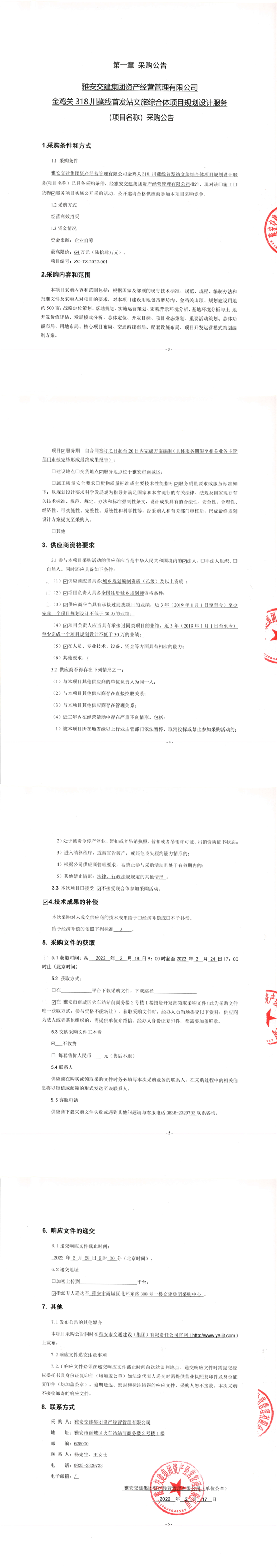 雅安交建集團(tuán)資產(chǎn)經(jīng)營管理有限公司金雞關(guān)318.川藏線首發(fā)站文旅綜合體項目規(guī)劃設(shè)計服務(wù)采購公告