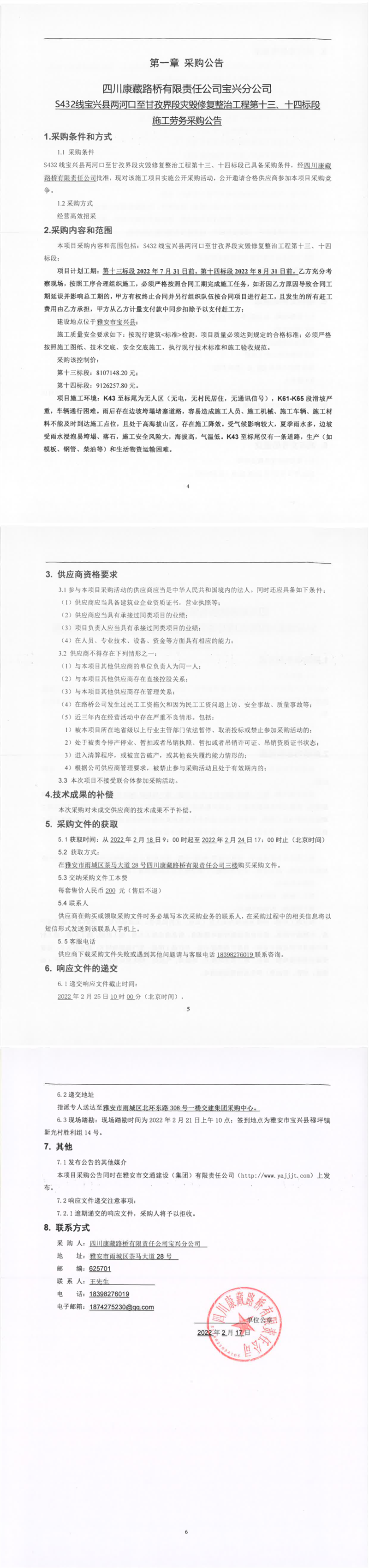 四川康藏路橋有限責(zé)任公司S432線(xiàn)寶興縣兩河口至甘孜界段災(zāi)毀修復(fù)整治工程第十三、十四標(biāo)段施工勞務(wù)采購(gòu)公告
