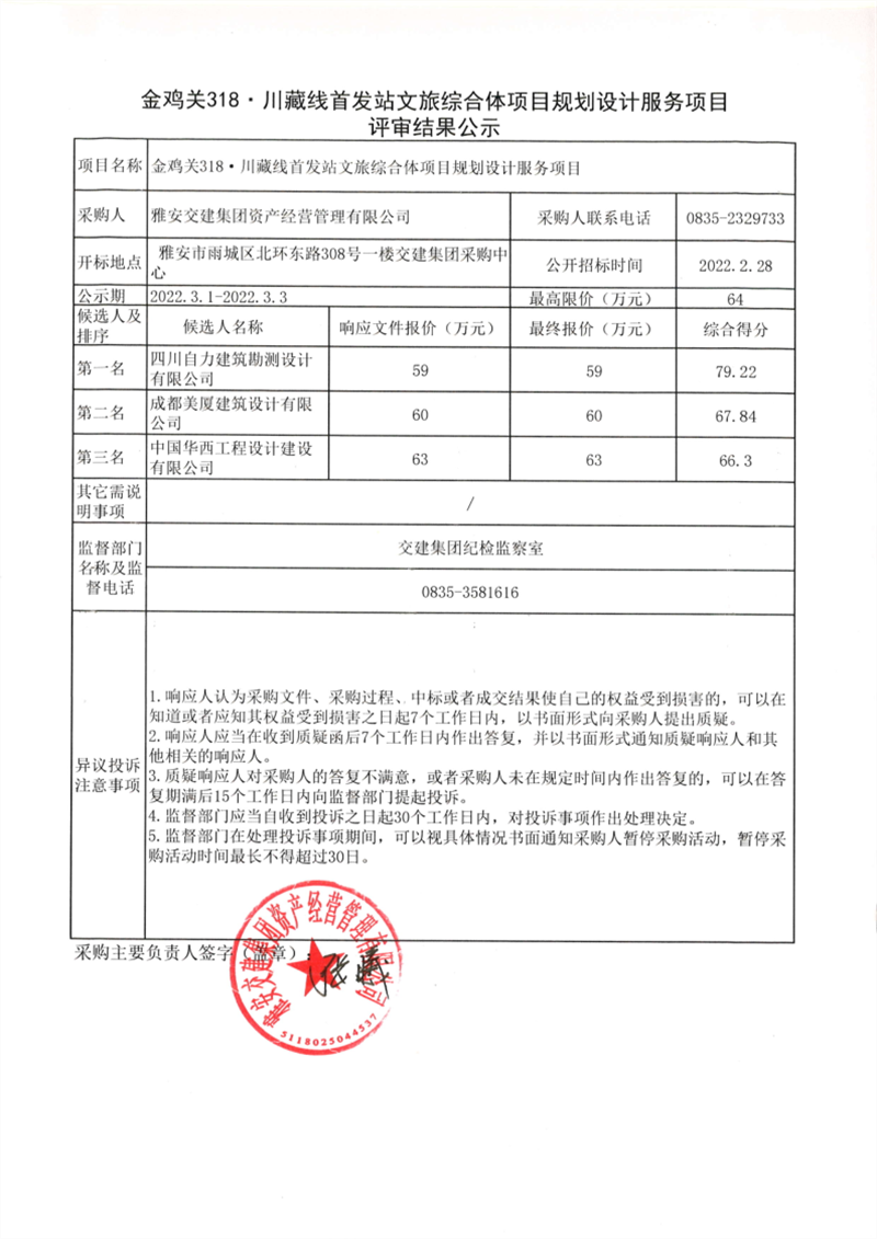 雅安交建集團資產(chǎn)經(jīng)營管理有限公司金雞關(guān)318.川藏線首發(fā)站文旅綜合體項目規(guī)劃設(shè)計服務(wù)項目評審結(jié)果公示