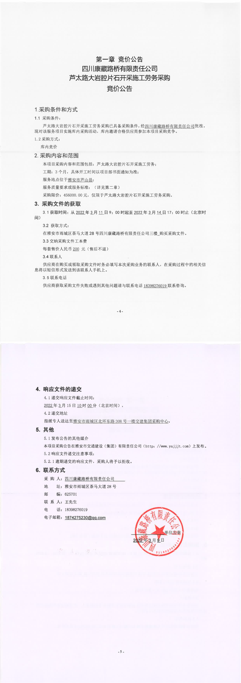 四川康藏路橋有限責(zé)任公司蘆太路大巖腔片石開采施工勞務(wù)采購競價公告