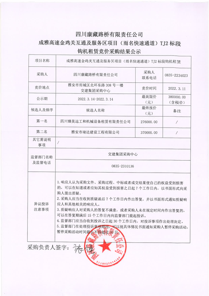 四川康藏路橋有限責(zé)任公司成雅高速金雞關(guān)互通及服務(wù)區(qū)項(xiàng)目(雨名快速通道)TJ2標(biāo)段鉤機(jī)租賃競價(jià)采購結(jié)果公示