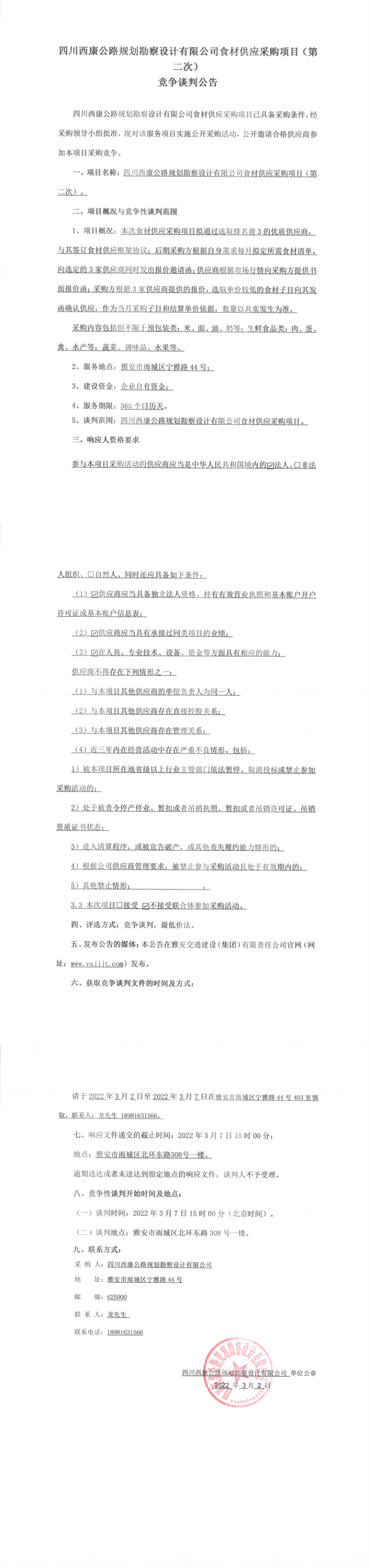 四川西康公路規(guī)劃勘察設計有限公司食材供應采購項目(第二次)競爭談判公告