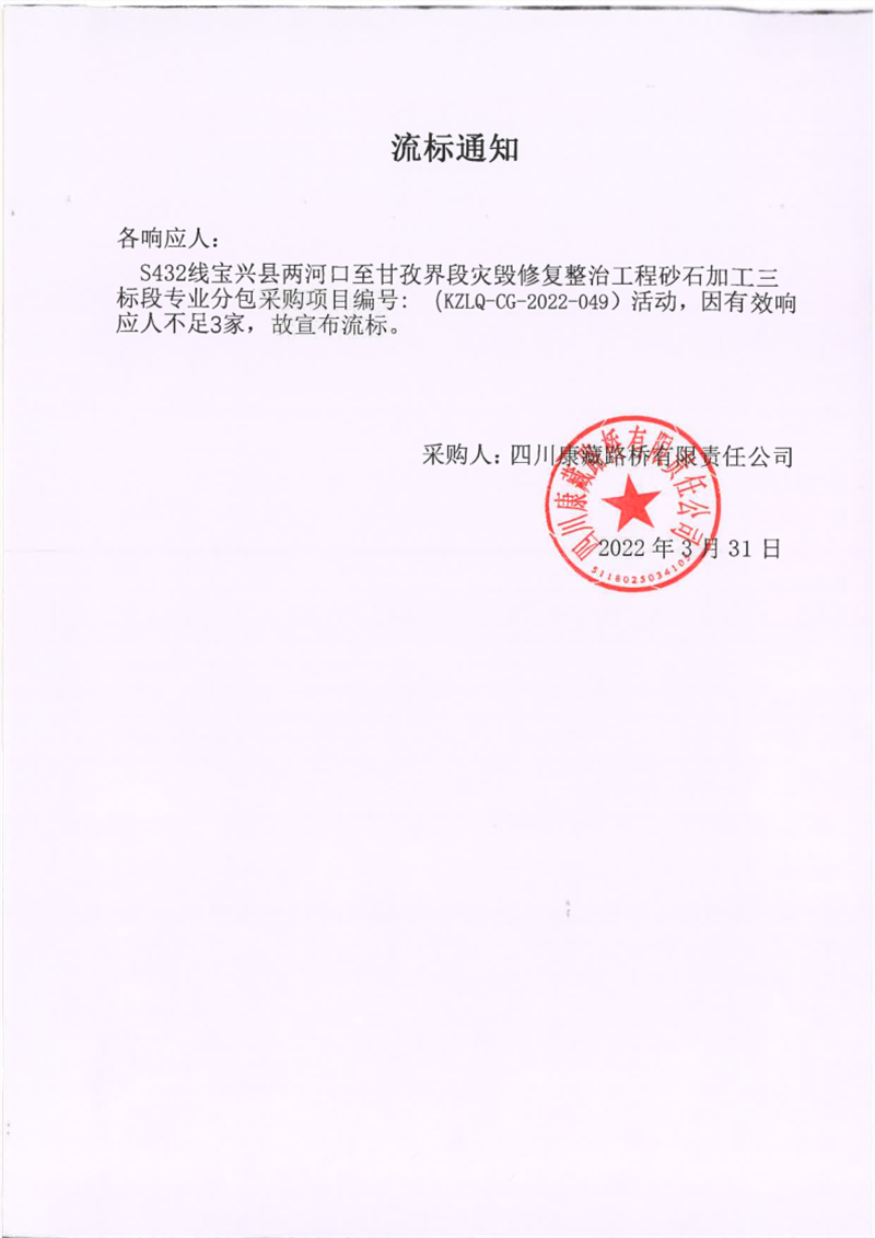四川康藏路橋有限責任公司S432線寶興縣兩河口至甘孜界段災毀修復整治工程砂石加工三標段專業(yè)分包采購項目流標通知