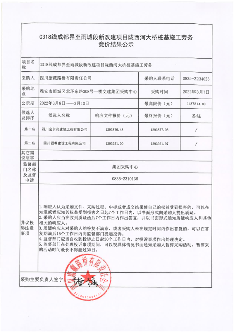 四川康藏路橋有限責任公司G318線成都界至雨城段新改建項目隴西河大橋樁基施工勞務(wù)競價結(jié)果公示
