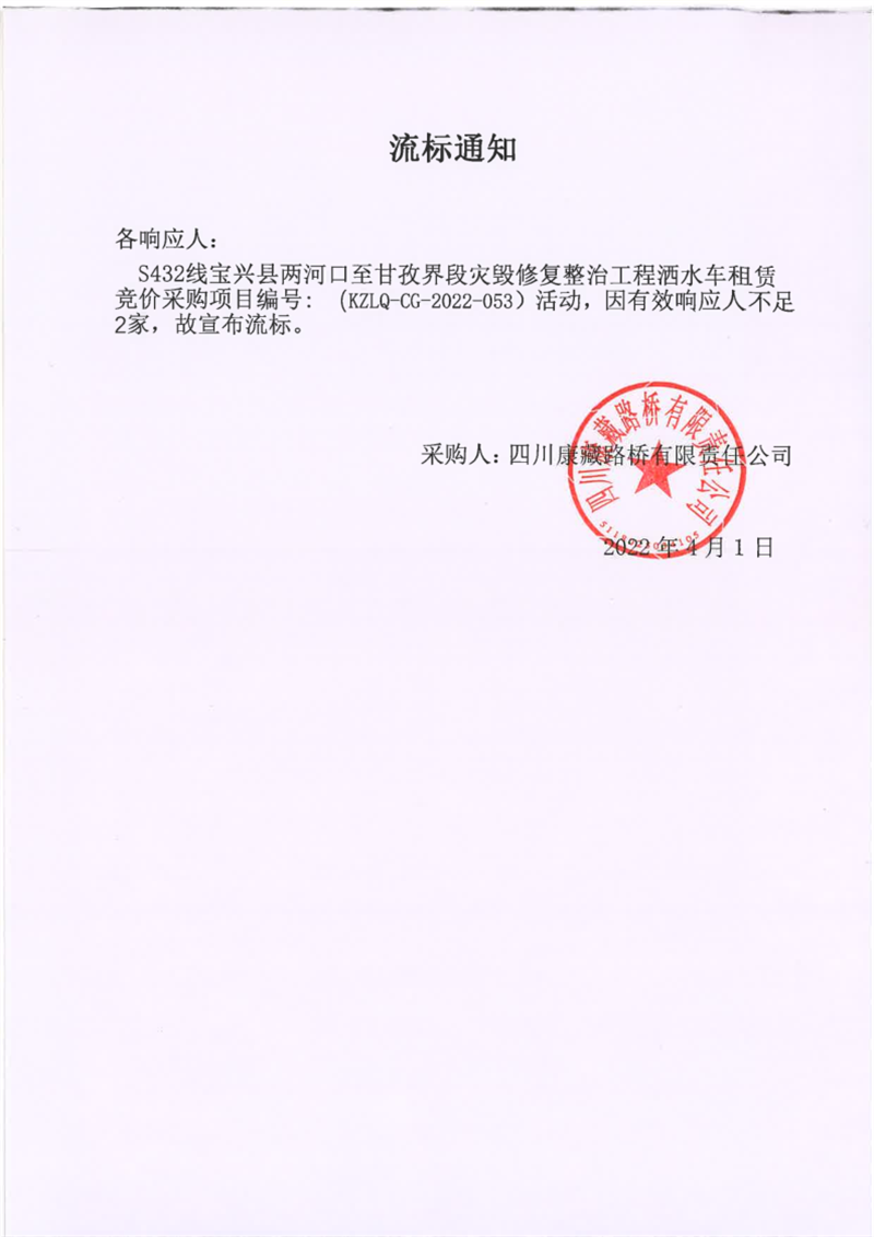 四川康藏路橋有限責(zé)任公司S432線寶興縣兩河口至甘孜界段災(zāi)毀修復(fù)整治工程灑水車租賃競價采購項目流標(biāo)通知
