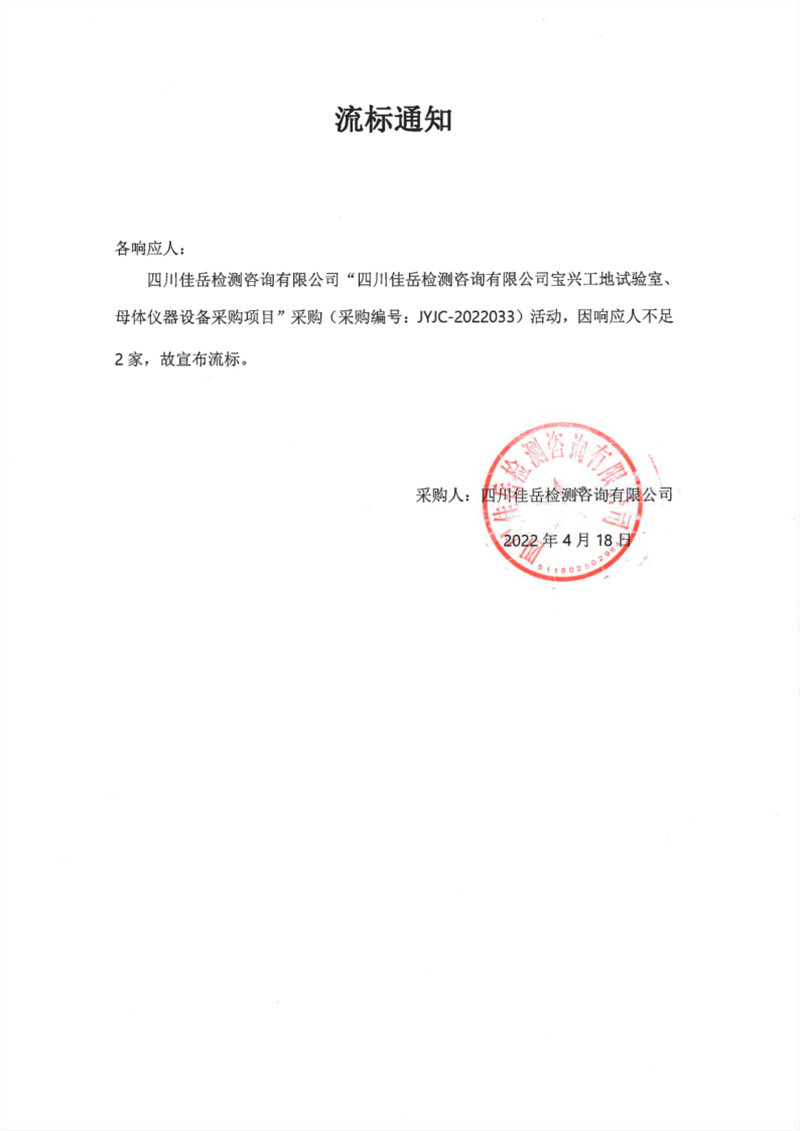 四川佳岳檢測咨詢有限公司寶興工地試驗室、母體儀器設備采購項目流標通知