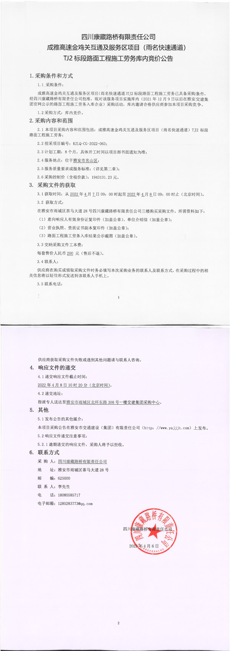 四川康藏路橋有限責任公司成雅高速金雞關(guān)互通及服務(wù)區(qū)項目(雨名快速通道)TJ2標段路面工程施工勞務(wù)庫內(nèi)競價公告