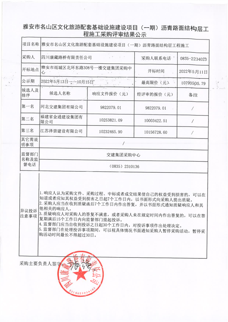 四川康藏路橋有限責(zé)任公司雅安市名山區(qū)文化旅游配套基礎(chǔ)設(shè)施建設(shè)項(xiàng)目(一期)瀝青路面結(jié)構(gòu)層工程施工采購評審結(jié)果公示