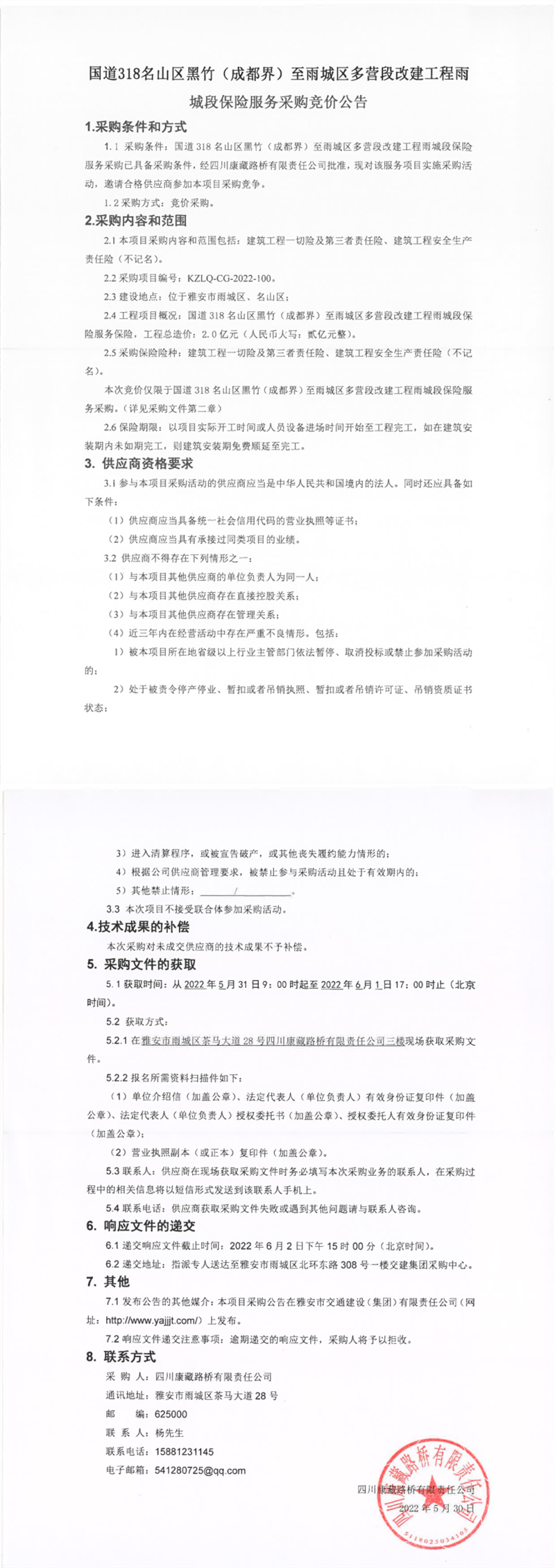 四川康藏路橋有限責(zé)任公司國(guó)道318名山區(qū)黑竹(成都界)至雨城區(qū)多營(yíng)段改建工程雨城段保險(xiǎn)服務(wù)采購(gòu)競(jìng)價(jià)公告