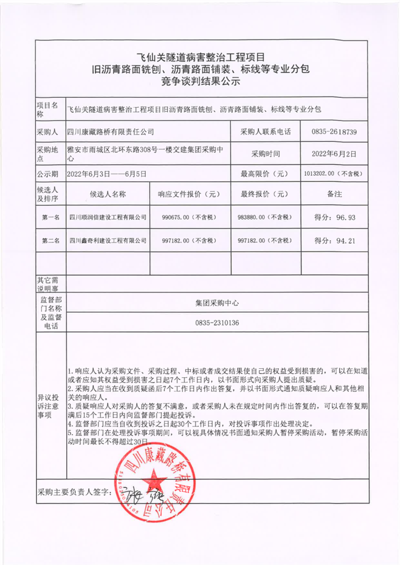 四川康藏路橋有限責任公司飛仙關隧道病害整治工程項目舊瀝青路面銑刨、瀝青路面鋪裝、標線等專業(yè)分包競爭談判結果公示