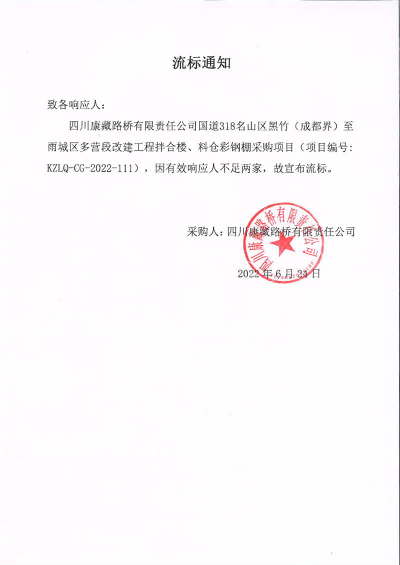 四川康藏路橋有限責(zé)任公司國道318名山區(qū)黑竹(成都界)至雨城區(qū)多營(yíng)段改建工程拌合樓、料倉彩鋼棚采購項(xiàng)目流標(biāo)通知